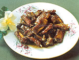 3. Das ?l in einer Pfanne bei mittlerer Flamme auf gut 110 Grad erhitzen, die Rippchen darin braten, bis sie sich verf?rben, herausnehmen und sie voneinander l?sen. Das ?l wieder erhitzen und die Rippchen nochmals gr?ndlich braten, bis sie goldbraun sind. Die Rippchen herausnehmen und das ?l abgie?en. Die Marinade in die Pfanne geben, die gebratenen Rippchen hinzuf?gen und unter R?hren noch einmal kurz braten.
