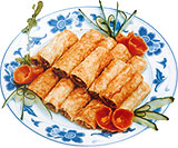 5. Das ?l in einem Wok bei schwacher Flamme auf etwa 70 ? 100 Grad erhitzen und die mit dem Teig aus St?rkemehl zusammengehaltenen Eierrollen darin frittieren. Wenn sie goldbraun sind, werden sie auf ein Brett gelegt, jede Rolle in 5 St?cke geschnitten und die insgesamt 20 St?cke dann auf einer Platte serviert.