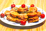 3. Die Lotoswurzeln sch?len, waschen und in 1 cm dicke Scheiben schneiden. Diese Scheiben nun noch einmal in der Mitte tief einschneiden und leicht auseinander klappen, so dass eine Art Tasche entsteht. Das Fleisch jeweils in die Taschen f?llen, sie wieder zusammendr?cken und in den verquirlten Eiern wenden. In einem Wok das ?l bei mittlerer Flamme auf etwa 110 ? 170 Grad erhitzen. Die Lotoswurzelscheiben darin braten, bis sie goldbraun sind, abtropfen lassen und auf einem Teller mit Tomatenmark oder scharfer Sojaso?e als W?rze an der Seite servieren.