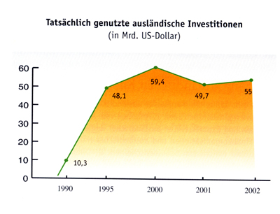 2002 hat China 55 Milliarden US-Dollar an Auslandskapital genutzt, davon 52,7 Milliarden US-Dollar an direkten ausl?ndischen Investitionen, und damit ist China zu dem Land geworden, das in der Welt das meiste Auslandskapital absorbierte. Die Staatliche Kommission für Entwicklung und Reform ist der Ansicht, dass dieser hervorragende Erfolg angesichts der Flaute der Weltwirtschaft und des drastischen Abstiegs des Investitionsvolumens in der Welt ausschlie?lich der gewissenhaften Einhaltung der Zusagen bei Chinas WTO-Beitritt, u.a. derA Senkung des gesamten Zollniveaus, der Abschaffung von Beschr?nkungen im Bereich der Investitionen und Finanzierungen seitens ausl?ndischer Gesch?ftsleute, der weiteren ?ffnung und der umfangreichen Revidierung bzw. Vervollst?ndigung von Gesetzen und gesetzlichen Verordnungen, zu verdanken ist.