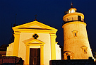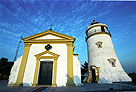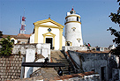 東望洋砲臺は澳門半島の最高峰である松山の頂上に位置し、半島全體を鳥瞰することができる。この砲臺は1637年に築造され、敷地面積は約800平方メートル、主に花崗巖で構築されたものである。砲臺の上には燈臺と小さな教會堂などの建築物がある。燈臺は1864年に築造され、中國の海岸線における最初の燈臺であり、その所在する地點の座標値はとりもなおさず世界地図における澳門の所在する地理的位置である。燈臺は円柱形構造を呈し、底部の半徑は7メートル、上へ行くほど縮小して5メートルとなり、高さは15メートル。教會堂は1626年に建てられ、1998年に教會堂の中からかなり以前のものと見られる長い壁畫が発見され、その絵畫の技法は中國と西洋蕓術の手法を融合させたもので、かなりの価値がある。 |