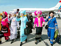 第10期全國人民代表大會(全人代)第2回會議と第10期政治協商會議全國委員會(全國政協)第2回會議の開催を控え、會議に出席する代表と委員がこの數日、続々と北京入りしている。 寫真は、3月1日、北京入りした広西チワン族自治區?全人代代表団 「人民網日本語版」2004年3月2日