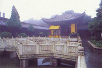 普陀山の第二のお寺は法雨寺である。四百年の歴史を持つこの法雨寺は、黃金色の瓦が太陽の光を受けて輝いている。この瑠璃瓦は、清の皇帝の命令によって、明の都南京の宮殿を取り壊し、それをわざわざ南京から運(yùn)んできたものである。