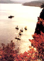 松花湖はその名にふさわしく、獨特の様相を呈する高山の湖。両岸には峻険な山々が聳え立ち、怪石が折り重なりあって、その姿を湖面に映している。湖は數多くの小島があるが、なかでも著名なのが「五虎島」。5頭の小さなトラが戯れているかのようだ。