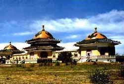 12世紀(jì)頃のモンゴル族の首領(lǐng)?ジンギスカン(1162-1227年)の陵墓である。伊金霍洛旗に位置する。包頭から南へ東勝を経由して120km。主體建築は3つのモンゴル族の住居、パオの形をした大殿からなっており、中央は記念堂になっている。記念堂の裏にジンギスカン夫婦の柩が安置されている。陵墓全體は壯大で、線香の煙がゆらぎ、國內(nèi)外からの參拝客は多い。毎年4回の正式祭祀活動(dòng)があり、盛大でにぎやかである。