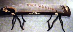 箏の共鳴箱は木製、長方形で、弦が胴板の上に張られ、これまで各地でよく使われていた箏は、絲弦あるいは銅絲弦を張り、弦の數は12、13、15あるいは16本で、弦の長さと音の高さは柱といわれる小さな柱を使って調節するようになっている。普通は「ミ、ファ、ラ、シ、ド」の5音で構成される。改造後の箏は、鋼絲弦を張り始め(楽曲の必要から絲弦を張っているものもまだある)、弦の數を増やし、19、21、25、26本を張るものも現われ、そして手や足でコントロールする調子調節の裝置がつけられているものもある。改造後の箏は、音域がさらに広くなり、音量が大きくなり、調子も調節しやすく、表現力も豊かになっている。箏は獨奏、伴奏および器楽合奏に用いられる。