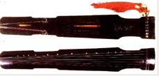 古い弾奏弦楽器の一つであり、七弦琴ともいわれている。琴という名稱は最も早くは春秋時代(前722-前481)末期の『詩経』に記載されているが、琴が現(xiàn)れたことはもちろん『詩経』の出現(xiàn)の以前であろう。琴の胴體は細(xì)くて長い木製の共鳴箱でもあり、その上に厚い漆が塗られており、7本の弦が張ってある。広い一端は頭部で、その下に音を調(diào)整する小さな軸があり、腰部以下のところに弦を結(jié)ぶものが2つあり、琴の表面の外側(cè)に13の円形の標(biāo)識があり、琴徽と呼ばれている。琴の形態(tài)?構(gòu)造には仲尼式、連珠式、落霞式、芭蕉葉式などたくさんある?;緲?gòu)造は琴面、琴底、琴首、琴軫(軸)、雁足、琴腹、琴徽、琴弦などからなる。弦が宙に浮くように琴の表面に張られており、琴の表面にホコーダーがない。演奏の際、琴を水平に機の上に置き、左手で弦をなでるようにしたり徽を押したりし、右手は岳山のところで弦を弾く。調(diào)子合わせは、調(diào)性と曲調(diào)によって変化もまちまちで、多くは五聲音階で調(diào)子を合わせ、よく使われる方法は外側(cè)の1本目の弦から內(nèi)側(cè)の7本目の弦までという順序で行う。近年來、琴の共鳴箱を改良し、絹糸の弦をビニールの糸で包んだ鋼線の弦に改め、音量をいくらか大きくした。このほか、螺子のある軸に改め、それによって琴の弦をきつく締めることにした。