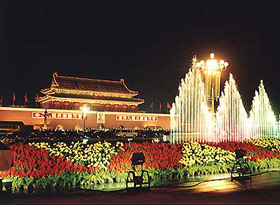 天安門広場は都市の広場としては、世界の著名都市の中でも最大規模の広場である。南北方向の長さは880メートル、東西方向の長さは500メートル、面積は44萬平方メートル。毎朝、荘厳な五星紅旗が旭日が昇ると同時に掲揚され、夕日が沈むと同時に降ろされる。