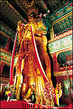 余り、高さ約5メートル、厚さ30センチ。金や銀、銅、鉄、スズの5種類の金屬で製作された「五百羅漢」は雍和宮で「3大絶品」の1つに數(shù)えられている。萬仏閣に奉納された巨大な木彫仏像「マイダラ仏」。高さ18メートルで、地中にある部分を含めると背丈は26メートルになる。これも「3大絶品」の1つであり、1990年にギネスに登録された。