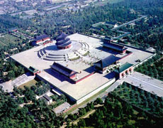 北京の南にある天壇は中國に現存する最大の祭祀用建築物群である。內壇と外壇に分かれ、主な建築物は內壇で、祭祀の行事は主に內壇で行われる。南には圜丘、北には祈年殿がある。真中は「神道」と呼ばれる高くて幅の広い石を敷き詰めた道。天壇の南側は四角形、北側は円形を呈しており、昔の中國人の、天は円形で地は四角形という宇宙に対する考え方を象徴するものである。天壇の中で最も雄大な建築物は五穀豊穰を祈る本殿の祈年殿で、丸くて白い3重の土臺の上に、頂上部にはかわらが葺かれ、金めっきを