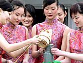 寫真は3月22日、2005年日本愛知萬博中國館のイメージキャラクター(寫真の左1、左2)が杭州市の西湖の水を宋代の磁器を模倣した容器に注いでいるところ。この西湖の水は杭州市の代表団によって、3月23日に日本の愛知萬博中國館に屆けられることになっており、日本の岐阜市の長良川湖の水と一緒に容器に注がれ、金魚を飼う水として使うで、中日両國の國民の間の友情が末長く続くことを象徴することになっている。