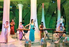 寫(xiě)真:中國(guó)館の開(kāi)館初日、メーンオブジェ「いのちの樹(shù)」の間で演奏する中國(guó)民族音楽の女性バンド