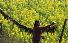 寫真(左):桃花源風景區で特産の漬物を陰干しする農家の女性=29日撮影