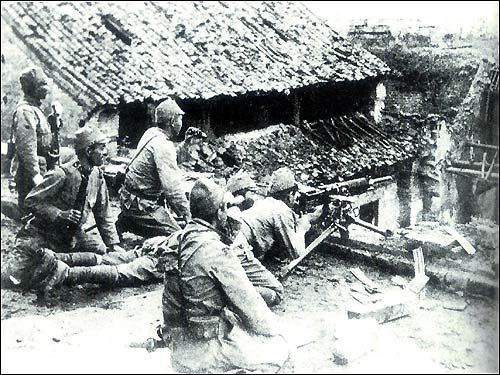 1944年4月、日本軍は「1號作戦」を発動。寫真は、河南省信陽城內の民衆を機銃で掃射する日本軍