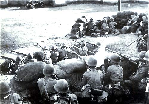 1937年7月26日、日本軍は河北省廊坊駐屯の第29軍を攻撃、中國軍の抵抗に遭遇。寫真は、廊坊の日本軍陣地