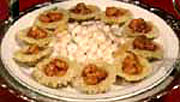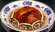 2、 タマゴをノリ狀のものにして、エビをすりつぶしたものをつけ、「如意」の巻きもののように巻いて、熟するまで蒸してから薄切りにし、アヒルの塊の周りに並べる。