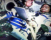 楊利偉氏はまず、自分の現在の體調は非常に良好であると伝え、黨?政府の指導者のご配慮に感謝の意を表し、引き続き努力して任務を完ぺきに完成し、祖國と祖國の人民にすぐれた成果を捧げるつもりであると、みずからの決意を語った。