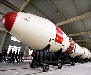 Visitors walk past Long March III carrier rocket at the Xichang Satellite Launch Center located in southwest China's Sichuan Province October 18. The country's first moon orbiter, Chang'e I, is set to be launched in late October.