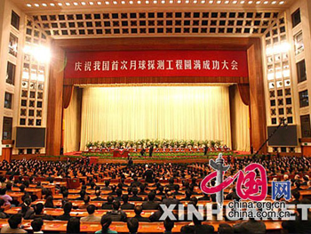 President Hu Jintao pledged Wednesday that China would adhere to the principle of peaceful development and use of outer space in concerted efforts with other nations at a grand ceremony to celebrate the success of China's first lunar probe Chang'e-1 in the Great Hall of the People.