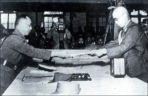От имени Японии Ясудзи передает Акт о капитуляции генералу Хэ Инциню.