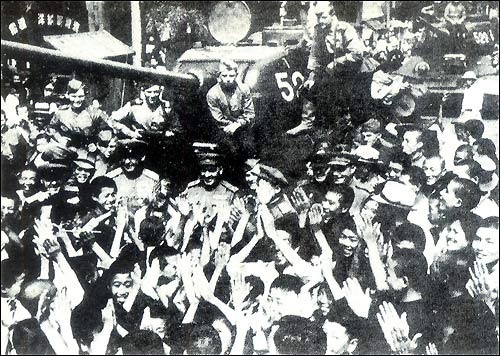 Население г. Даляня приветствует советских солдат.
