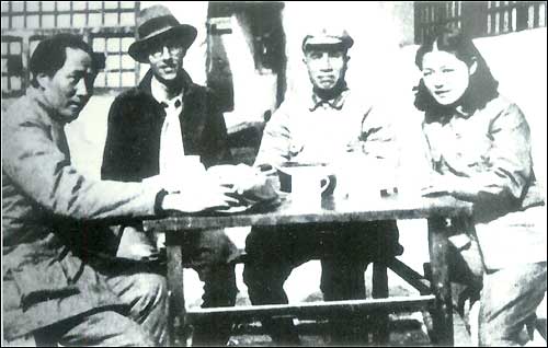 Мао Цзэдун и Чжу Дэ встречаются в Яньани с американским журналистом (второй слева). Предметом беседы была ситуация в Европе. Развитие событий в районе китайского театра военных действий имело влияние на исход всемирной с фашизмом, поэтому внимание мира было приковано к Яньани.