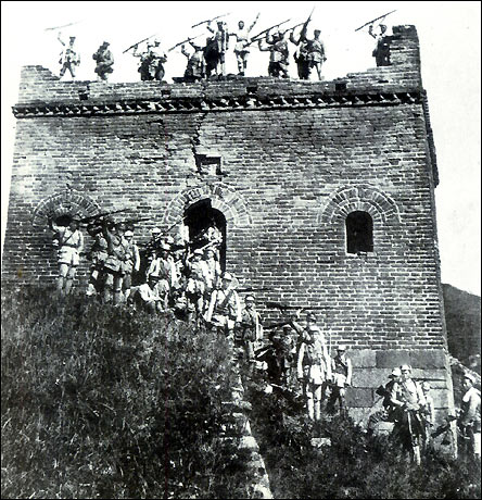 Летом-осенью 1940 года 8-я армия начала ?Битву ста полков?, в ходе которой уничтожила 20 тыс. чел. живой силы противника. На снимке: солдаты 8-й армии празднуют на сторожевой башне Великой стены победу во время второго этапа ?Битвы ста полков?.
