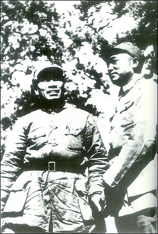 Главнокомандующий 8-й армией Чжу Дэ и заместитель командующего Пэн Дэхуай руководят операцией против карательного похода японцев в горах Тайханшаня.