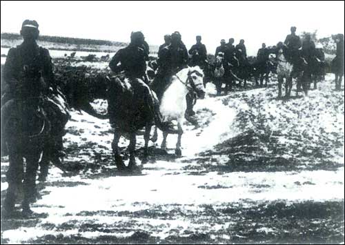 Весной 1938 г. Новый 4-й корпус развернул партизанскую войну в оккупированных японцами районах бассейна р. Янцзы и создал там центральнокитайскую антияпонскую демократическую базу. На снимке: конный полк Нового 4-го корпуса, антияпонская база в северной Цзянсу.
