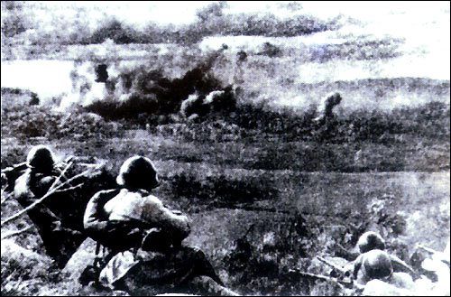 Уничтожающий огонь советской артиллерии по позициям японской армии.