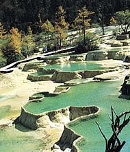Хуанлун находится в 65 км. от древнего уезда Сунпань. Вьющейся лентой тянется он на 7,5 километров по горной долине, лежащей на высоте 3000 метров над уровнем моря. Земля здесь устлана светло-желтым осадочным слоем из углекислого кальция, усеяна множеством больших и малых озер, каскадом спускающихся по горам, голубые и нежно-изумрудные, они так прозрачны, что просматриваются до самого дна. Издали Хуанлун и впрямь напоминает гигантского дракона, сверкающего на солнце своей чешуей. Так и пошло его название Хуанлун – желтый дракон. С обеих сторон долину обступают хвойные леса из могучих елей, а поляны покрыты сплошным зеленым ковром с синими, белыми, красными и фиолетовыми цветами.