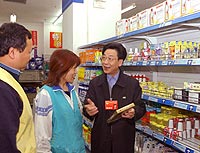 Вчера, 9 марта, Чжан Хуаань (справа) – депутат из провинции Фуцзянь и председатель правления компании по производству изделий бытовой химии ?Цзиньлу? приехал в пекинский супермаркет и интересовался ходом торговли товарами бытовой химии.