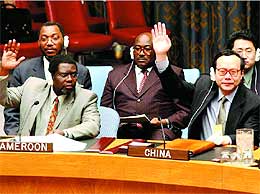 Будучи постоянным членом Совета Безопасности ООН Китай неизменно придерживается умеренной политики, утверждает справедливость, играет ответственную роль крупной державы в международных делах. Китай активно поддерживает международное сотрудничество и участвует в борьбе с терроризмом, выступает за ясность целей в борьбе с терроризмом, за одновременное применение различных вариантов борьбы, против двойных стандартов, против увязывания борьбы с терроризмом с определенными нациями и вероисповеданием. Действия Китая одобрены всем международным сообществом. Что касается горячих точек, то здесь Китай выступает за то, чтобы дорожить миром и посредством равноправных переговоров решать споры мирным путем; в полной мере выявлять важную роль ООН и Совета Безопасности в поддержании мира и безопасности во всем мире; утверждать новый взгляд на безопасность, заключающийся во взаимном доверии, взаимной выгоде, равноправии и сотрудничестве, укреплять взаимное доверие посредством диалога, добиваться общей безопасности посредством сотрудничества. Исходя из интересов стабильности международной и региональной обстановки, Китай отстаивает поиск путей политического решения иракского вопроса в рамках ООН. В ноябре 2002 г., когда Китай был очередным председателем СБ ООН, единогласно принята резолюция 1441 СБ ООН, что позволило отстоять престиж ООН. Китай нанес поражение всем политическим попыткам в ООН расколоть Китай, ратующим за ?участие? Тайваня в деятельности ООН, ?приглашение Тайваня в качестве наблюдателя на Всемирной ассамблее здравоохранения?. В апреле на заседании Экономического и Социального Совета ООН Китай в азиатской подгруппе получил самое большое число голосов и вновь избран членом Комиссии ООН по правам человека до 2005 г.
