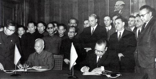 Подписание заместителем министра внешней торговли СССР И.Т.Гришиным и заместителем министра внешней торговли КНР Чжоу Хуаминем Соглашения о товарообороте и платежах между правительствами КНР и СССР. Москва, 5 август 1971 г.