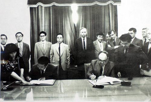 Подписание заместителем министра иностранных дел СССР Б. Н. Чаплиным и послом КНР в СССР Юй Хунляном Соглашения о взаимных поездках граждан. Москва, 15 июля 1988 г.