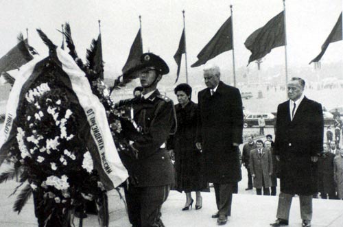 Президент Российской Федерации Б.Н. Ельцин с супругой и сопровождающими его лицами во время возложения венка к Памятнику народным героям на площади Тяньаньмэнь в Пекине. Пекин, декабрь 1992 г.