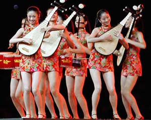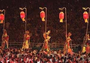 Después de que el alcalde de Beijing, Wang Qishan, recibió la bandera olímpica, la delegación china presentó un espectacular número musical, con un grupo de chicas coristas, luego otro de hombres y mujeres ejecutando ejercicios de artes marciales al compás de la música, para terminar con otro grupo que realizó vistosas maniobras con banderolas, mientras que en el pasarela superior desfilaban personajes con farolas de colores encendidas.