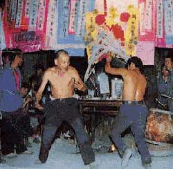 En general, de esta danza hay dos tipos. La del primer tipo se baila con arte marcial y conlleva una docena de movimientos difíciles y vigorosos, incluyendo “el tigre abraza la cabeza”, “el hombre pega” y “el buey friega la piel”, adecuados sólo a los jóvenes fuertes. Se presenta para dar el parabién en recuerdo del anciano que “se fue andando” y que tiene muchos hijos y nietos. La danza del otro tipo se caracteriza por el “llanto de duelo”. El movimiento principal es el de “cuatro pasos grandes”, de ritmo lento y de canto tan lúgubre, que entristece a todos. Habitualmente se baila cuando muere un joven.