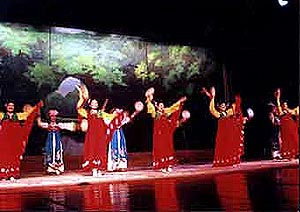 La Danza alegre de los agricultores, nacida de las faenas del campo, es una actividad de tradición popular y contiene elementos de las ceremonias antiguas con sacrificios. Habitualmente asume dos formas: Danza mímica con argumento, y representación de masas con danzas tradicionales apasionantes al comienzo del A?o Nuevo lunar o en celebración de la buena cosecha. Cuando es la ocasión, cada aldea envía un grupo de danza a los festejos locales. El grupo va precedido de una “bandera de orden” y una “bandera de agricultura”, en la cual está escrita la frase que dice “la agricultura es la base de todo”, y luego del director de la banda, quien toca un gong peque?o. Bajo la conducción de éste, marchan los músicos que portan flautas, trompetas y tambores y la guardia de honor compuesta de bailarines disfrazados de toda clase de personajes. Por último llegan los artistas listos para presentar la danza con tamborete, la danza con tambores planos, la danza con tamboril, la danza con abanicos, la danza de las cigüe?as, la danza con gorros de elefante, la danza con máscaras y el drama de mímica.