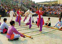 Allí bajo un baniano gigante, rodeado de gente, está bailando ya al compás del tamboreo una joven esbelta, quien viste una bata blanca, tiene el cabello amarrado con cintos de color violeta y con ambas manos gira alrededor del cuerpo y arriba y abajo dos palos mágicos de 40 cm de largo cada uno y forrados de cintas de color. Contorneándose a pasos menudos, repite los movimientos con primor, de cara al este, al sur, al oeste y al norte, para ahuyentar a los demonios y abrirles camino en despedida a los dioses y los ancestros. Conforme cambia el ritmo de los tambores, baila cada vez más rápido. De nuevo los espectadores se hierven, corriendo a la desbandada y mirando con la cabeza volteada la danza aún sin terminar, cual si buscaran un lugar apropiado donde parar. Súbitamente, la bailarina cesa de danzar y lanza los palos atrás por encima de la cabeza. Al instante, la gente trota con toda fuerza, pugnando por coger los palos que caen del aire.